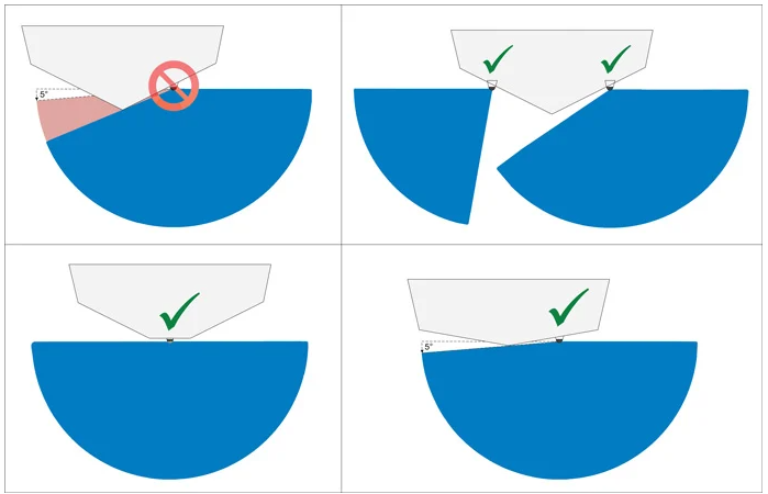 PLEASE NOTE FAIRINGS MOUNTED TO PORT OR STBD DEADRISE MUST NOT EXCEED 5DEG FROM THE BOTTOM OF THE TRANSDUCER FACE TO THE LOWEST SECTION OF HULL/KEEL - SEE THE BELOW ILLUSTRATION. CONTACT US IF YOU REQUIRE AN EXTRA DEEP TRANSDUCER FAIRING TO OVERCOME THIS CON-STRAIGHT